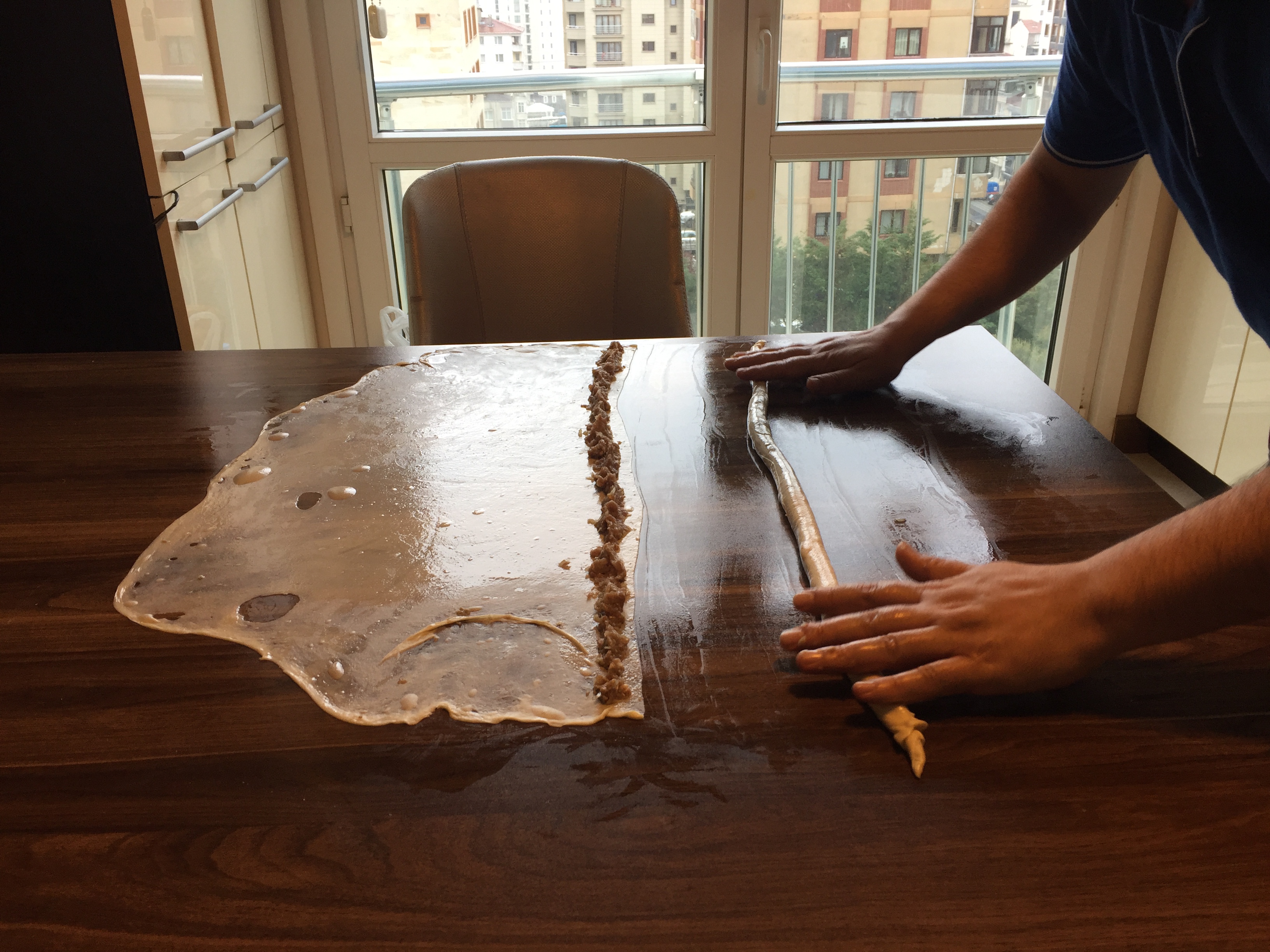 - Masanın veya tezgahın üzerine 2 yemek kaşığı yağ döküp elimizle zemine yayıyoruz (her hamurda masanın yağlı olup olmadığını kontrol ediyoruz) ve hamurlardan birini masanın üzerine alıyoruz.Önce merdane ile inceltiyoruz daha sonra elimizle hamurun köşelerinden çeke çeke uzatıyoruz. Hamur iyi yoğrulmuş , sakız gibi pürüzsüz olmuşsa ve üzeride yeterince yağlıysa uzayarak açılacaktır. Ufak tefek yırtıklar olabilir .
